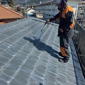 高圧洗浄で汚れを落とし、コーキング補充や必要な箇所の補修が終わったあといよいよ塗装です。