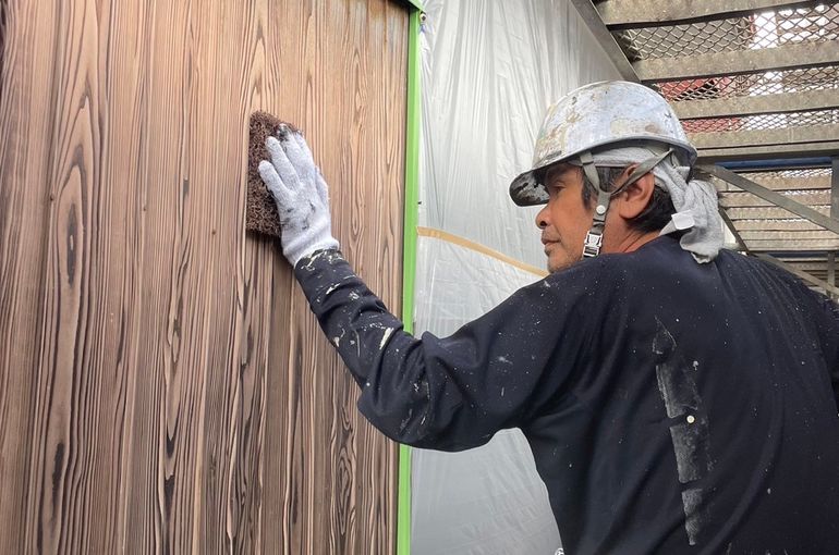 トタンの表面の汚れやサビをヤスリでしっかり落としています。