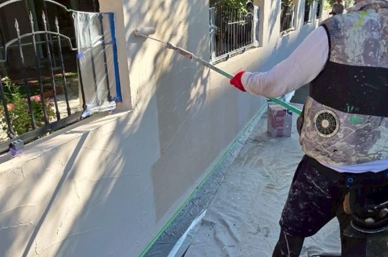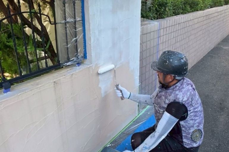 こちらは高圧洗浄機による洗浄と乾燥の後に下塗りを行なっているところです