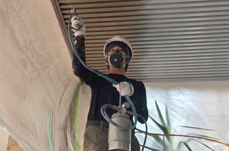 こういった天井の凹凸がある場所はスプレーガンにて塗装しています