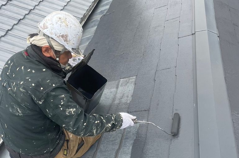 下塗り塗料はツヤがなく灰色や黒など地味な色ですが、屋根材と上から塗る塗料をしっかり密着させ、水の浸透を防ぐ役割のある塗料です。